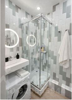 Санузел с душевой кабиной, всё выполнено в едином аккуратном стиле.