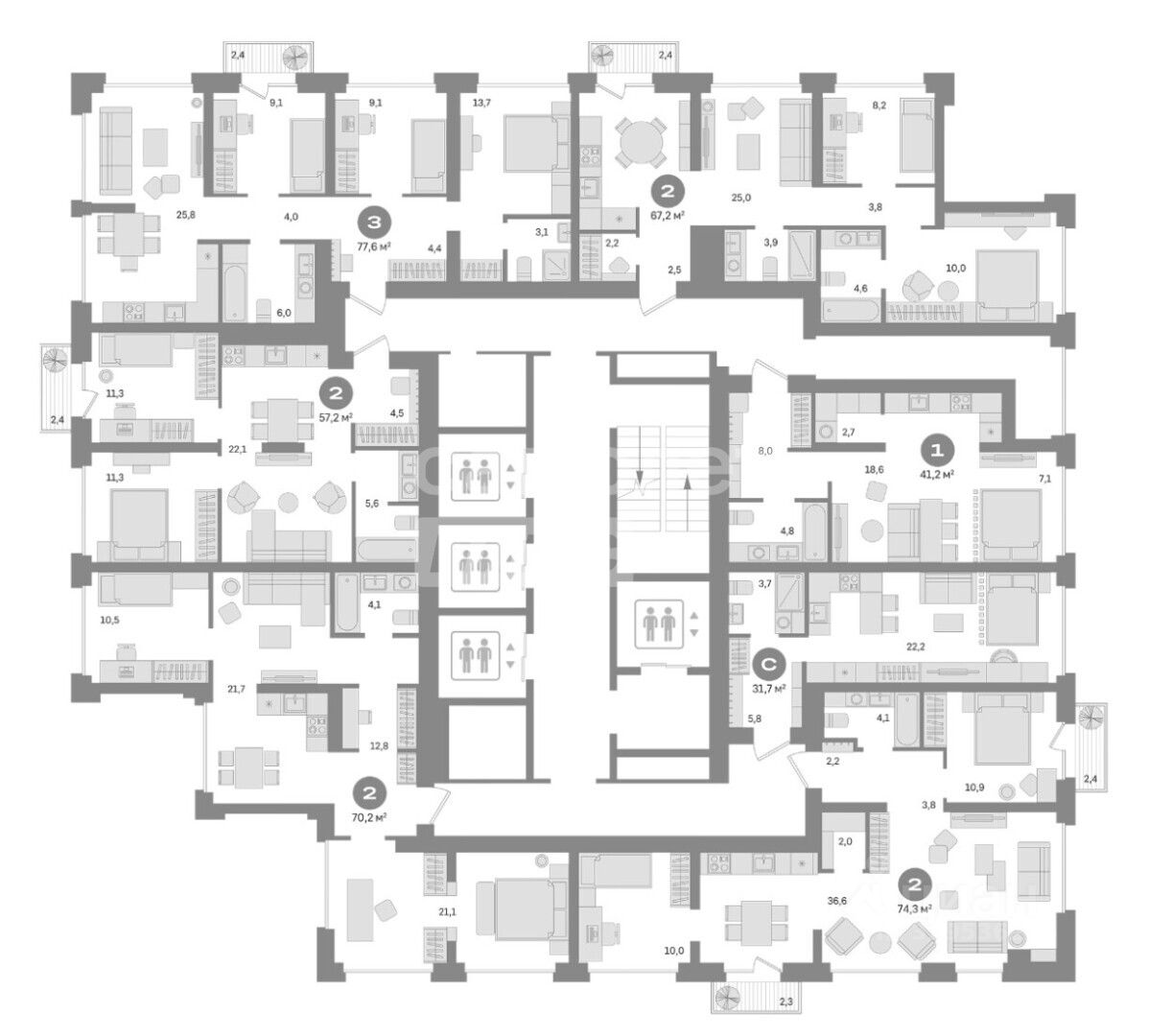 - 4 лифта на этаже — быстрый доступ и отсутствие ожидания