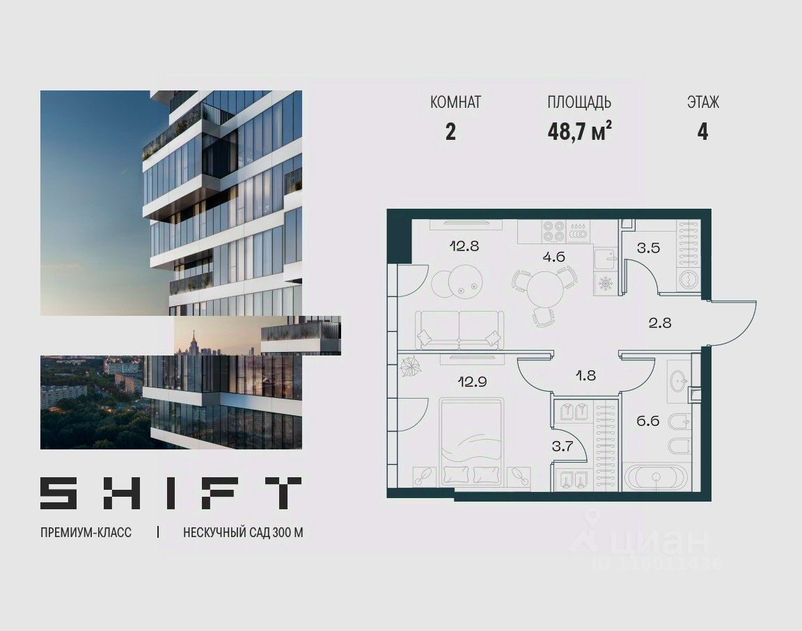 1-к квартира в премиальном комплексе SHIFT на 4-м этаже в 18 этажном здании. Общая площадь 48.7 кв. м.