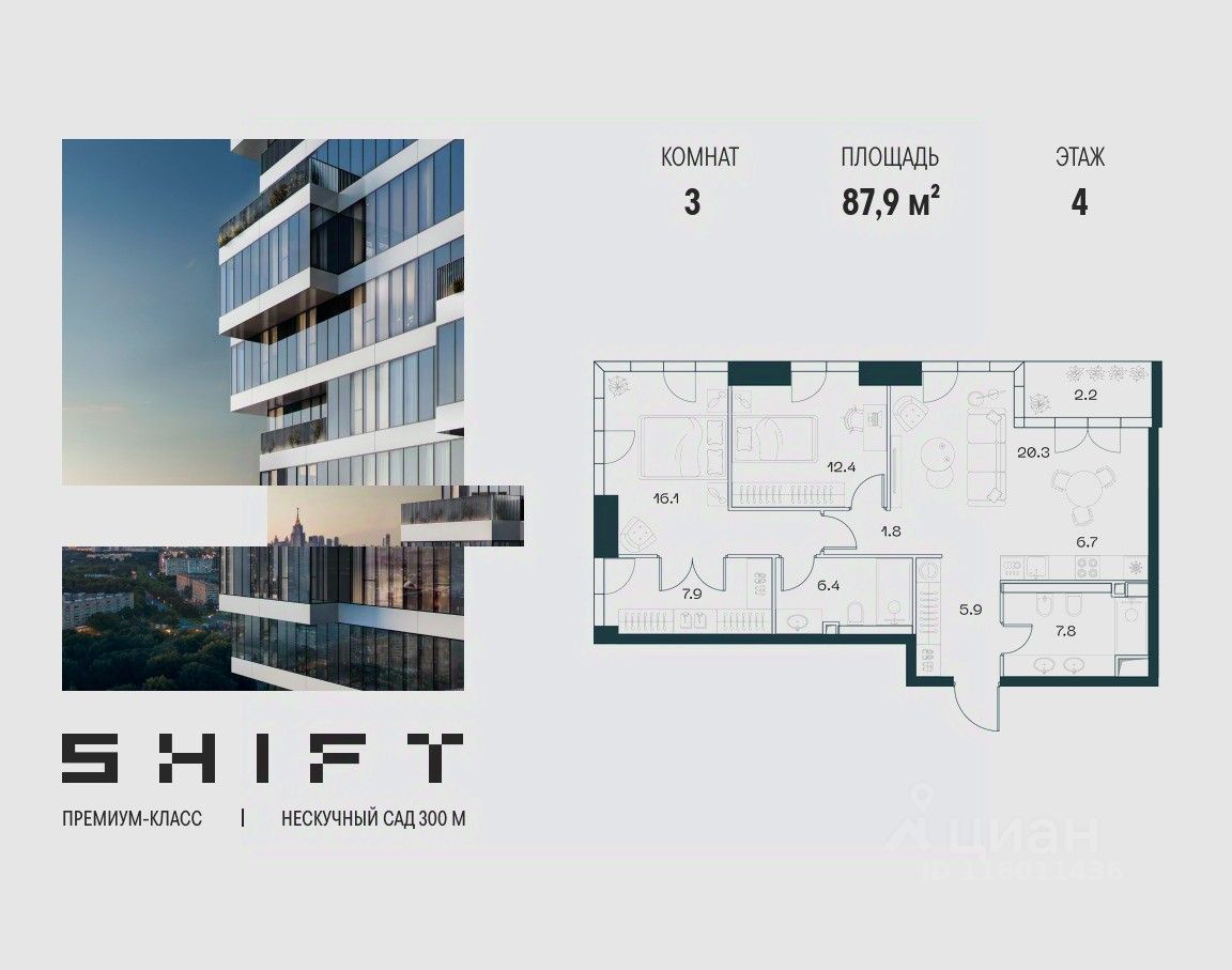 3-к квартира в премиальном комплексе SHIFT на 4-м этаже в 18 этажном здании. Общая площадь 87.9 кв. м.