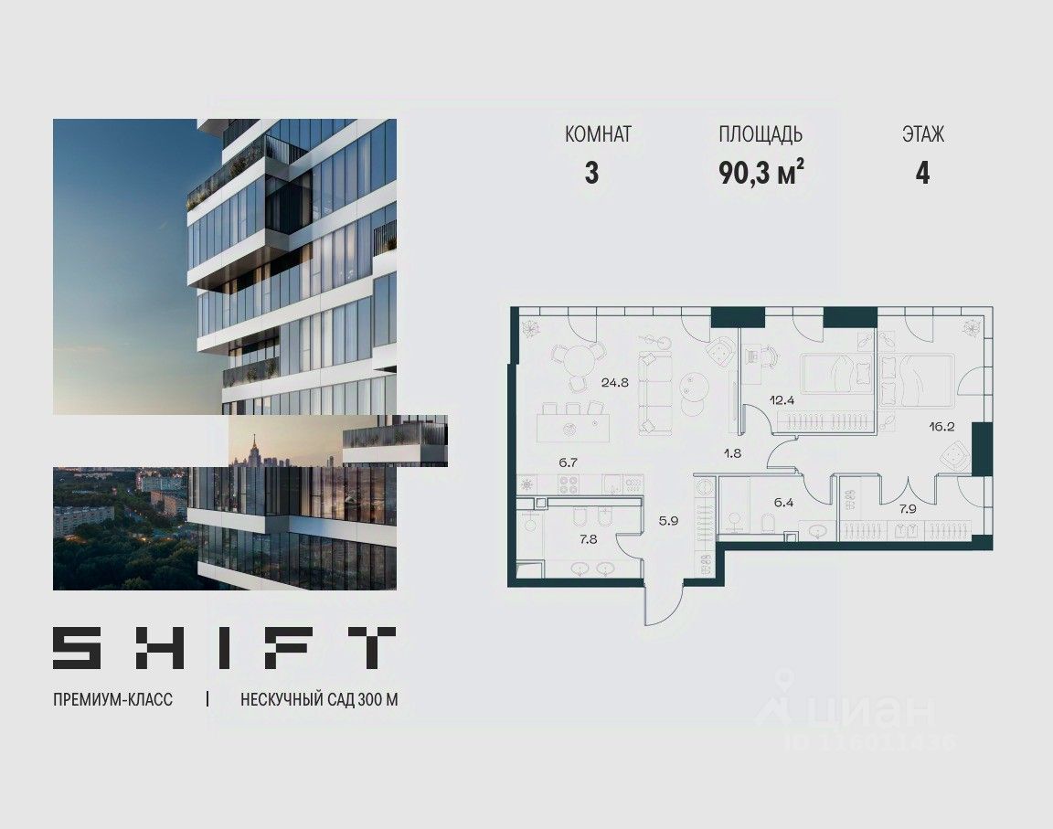 3-к квартира в премиальном комплексе SHIFT на 4-м этаже в 18 этажном здании. Общая площадь 90.3 кв. м.