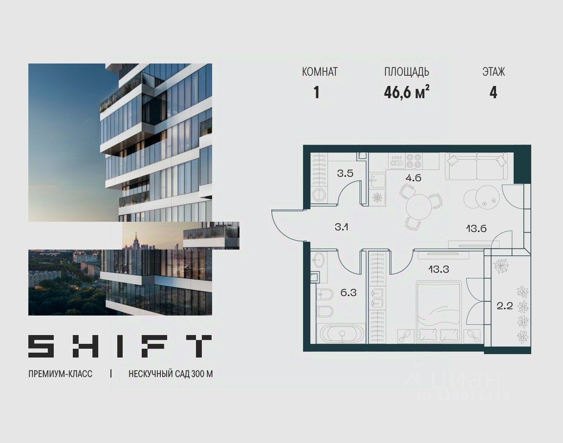1-к квартира в премиальном комплексе SHIFT на 4-м этаже в 18 этажном здании. Общая площадь 46.6 кв. м.
