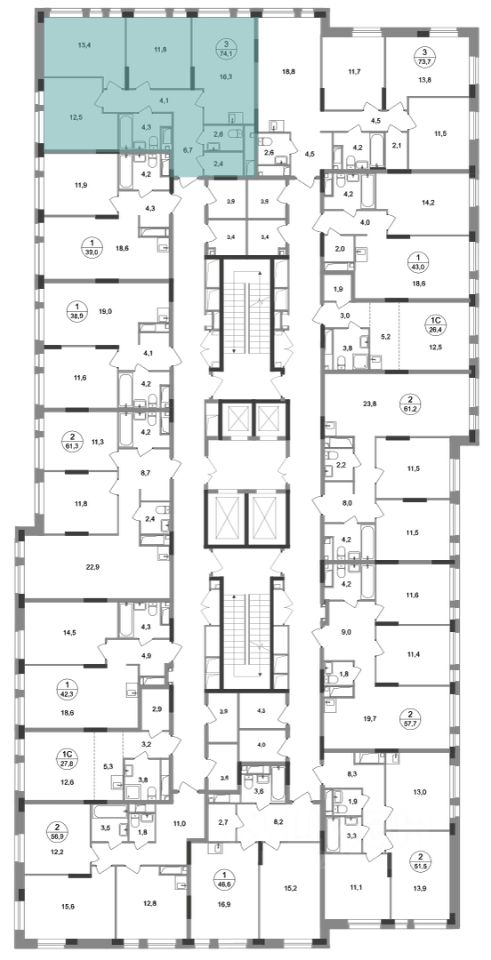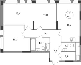 Общая площадь квартиры - 74,1 кв. м, этаж 13 из 19.