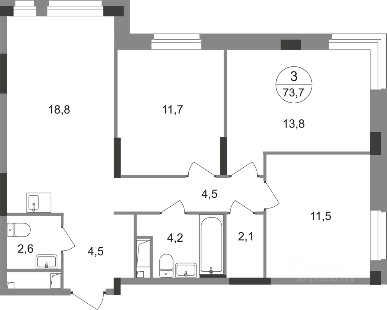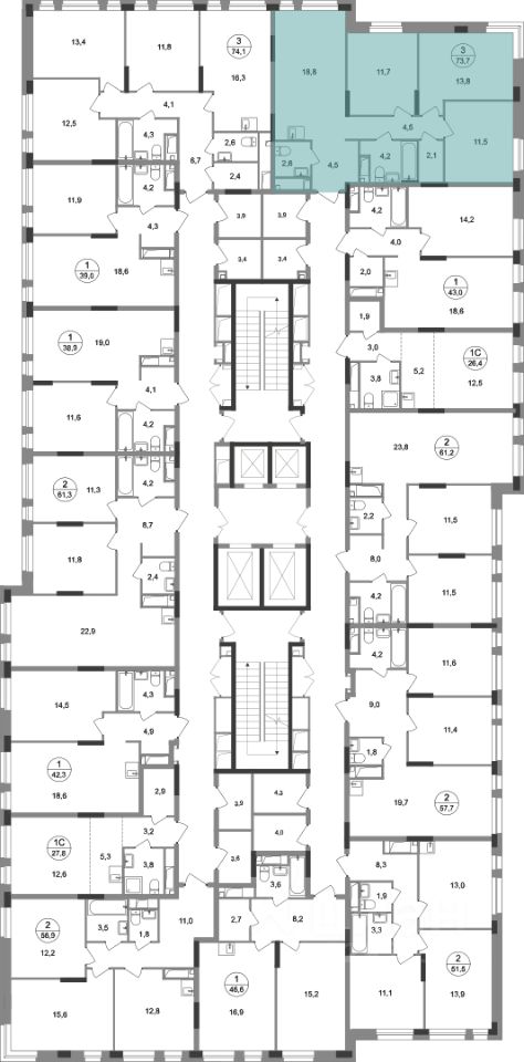 Общая площадь квартиры - 73,7 кв. м, этаж 14 из 19.