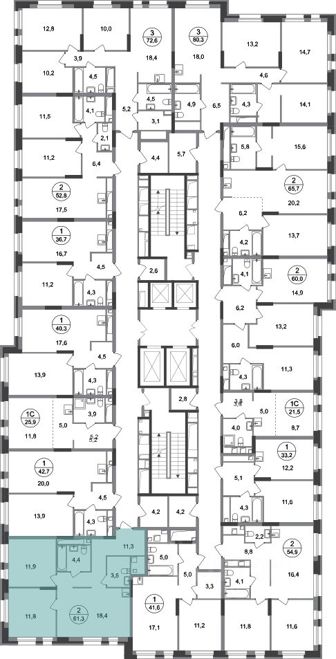 Общая площадь квартиры - 61,3 кв. м, этаж 12 из 20.