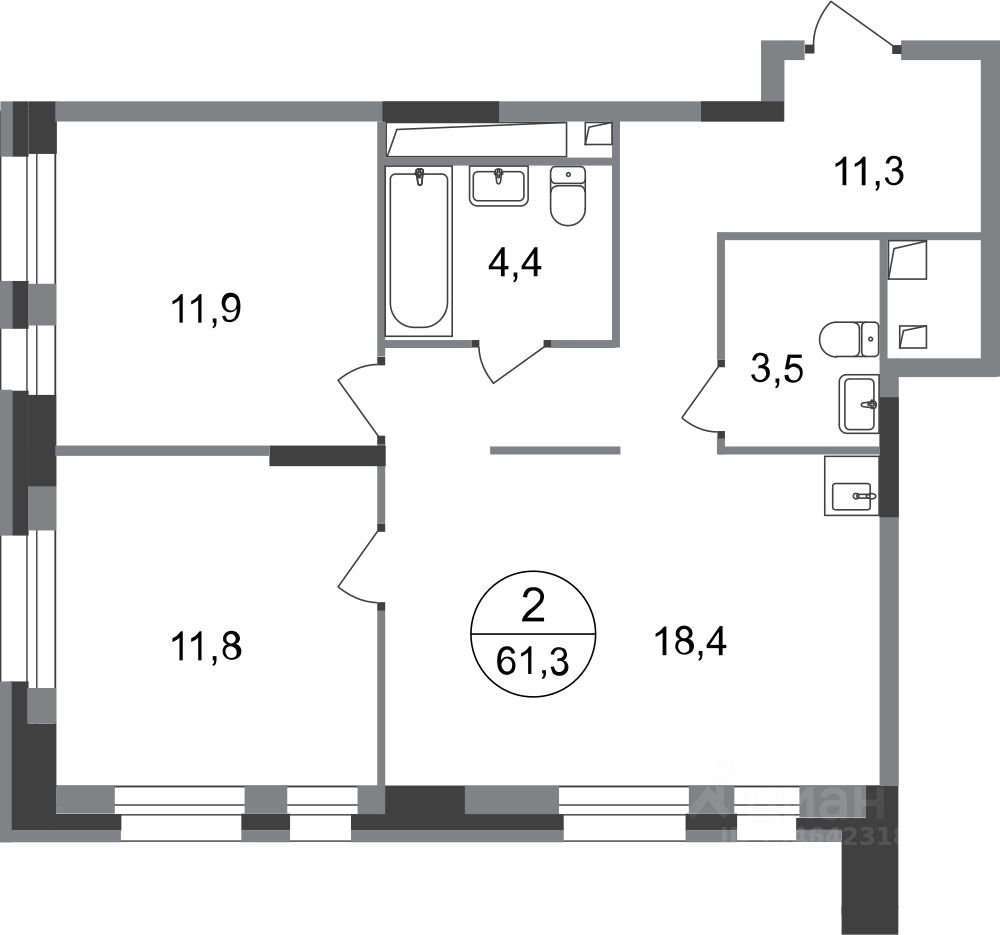 Общая площадь квартиры - 61,3 кв. м, этаж 4 из 20.