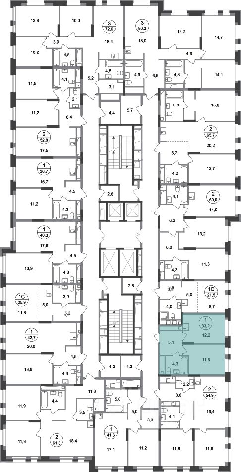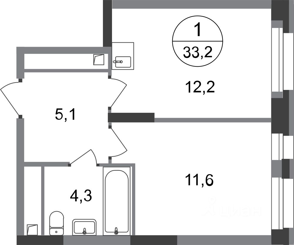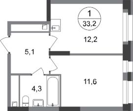 Общая площадь квартиры - 33,2 кв. м, этаж 12 из 20.