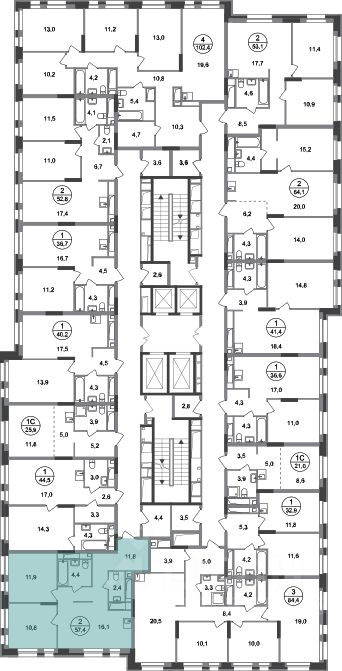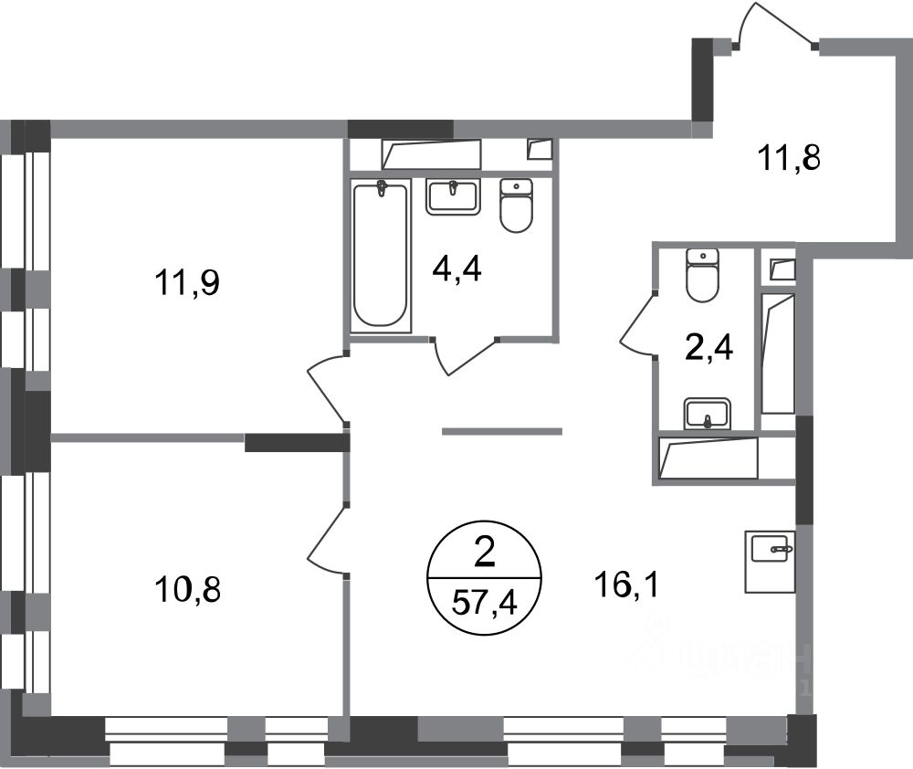 Общая площадь квартиры - 57,4 кв. м, этаж 9 из 20.