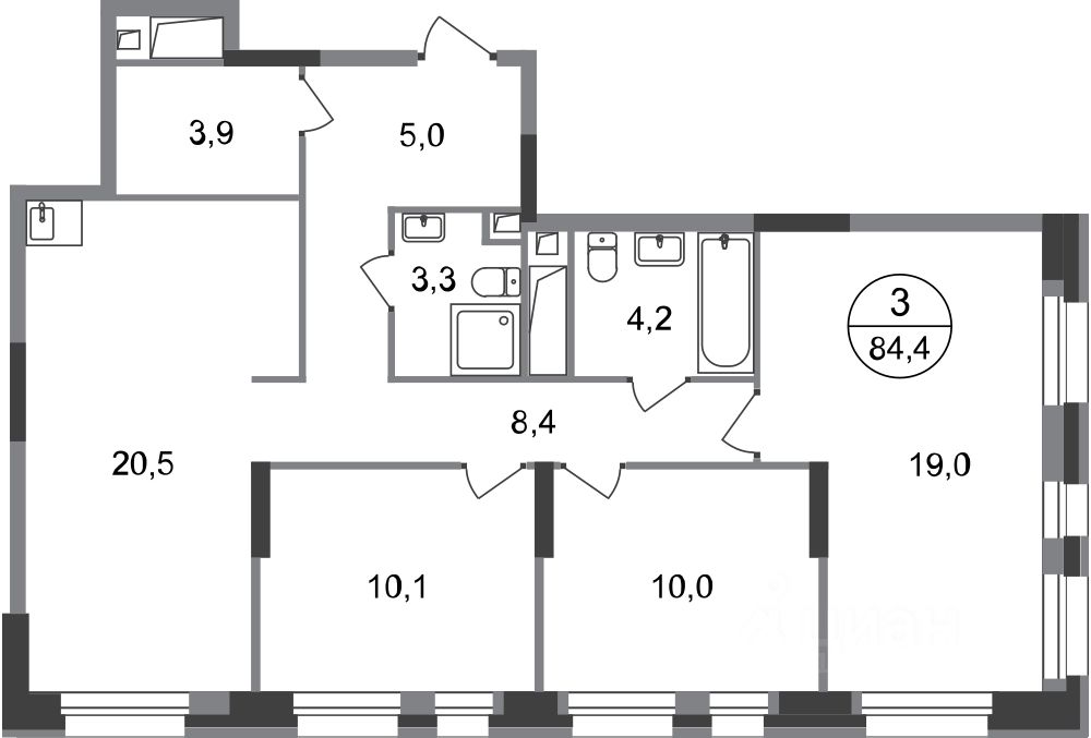 Общая площадь квартиры - 84,4 кв. м, этаж 11 из 20.