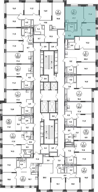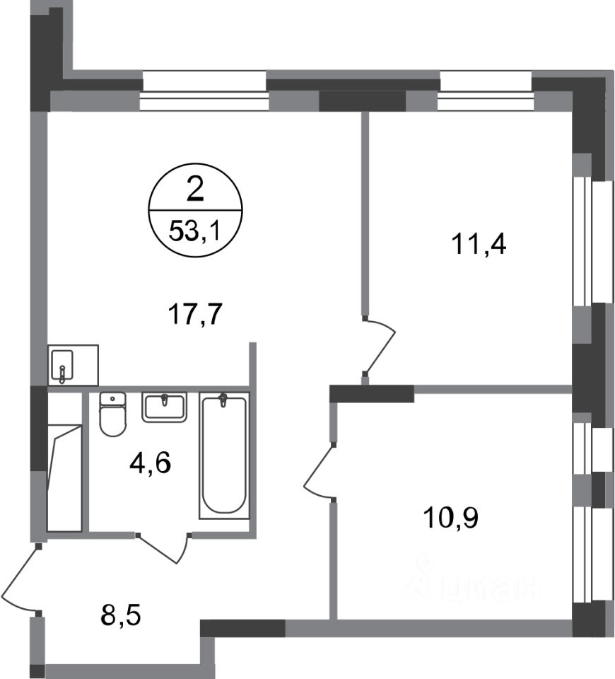 Общая площадь квартиры - 53,1 кв. м, этаж 13 из 20.