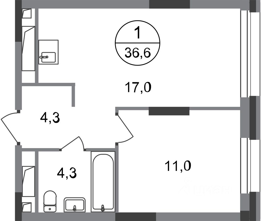 Общая площадь квартиры - 36,6 кв. м, этаж 15 из 20.