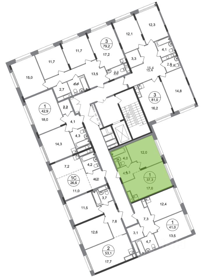Общая площадь квартиры - 37,3 кв. м, этаж 8 из 17.