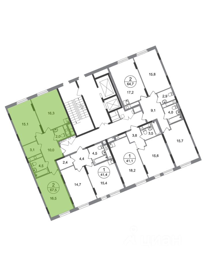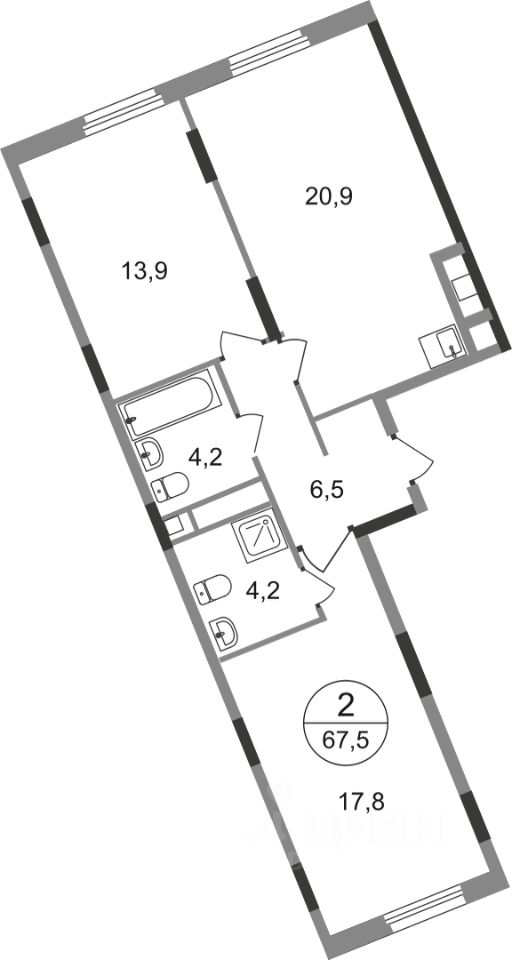 Общая площадь квартиры - 67,5 кв. м, этаж 12 из 17.