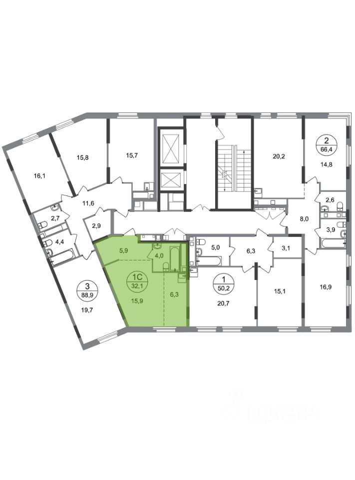Общая площадь квартиры - 32,1 кв. м, этаж 16 из 17.