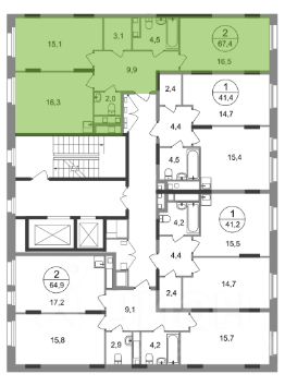 Общая площадь квартиры - 67,4 кв. м, этаж 9 из 17.