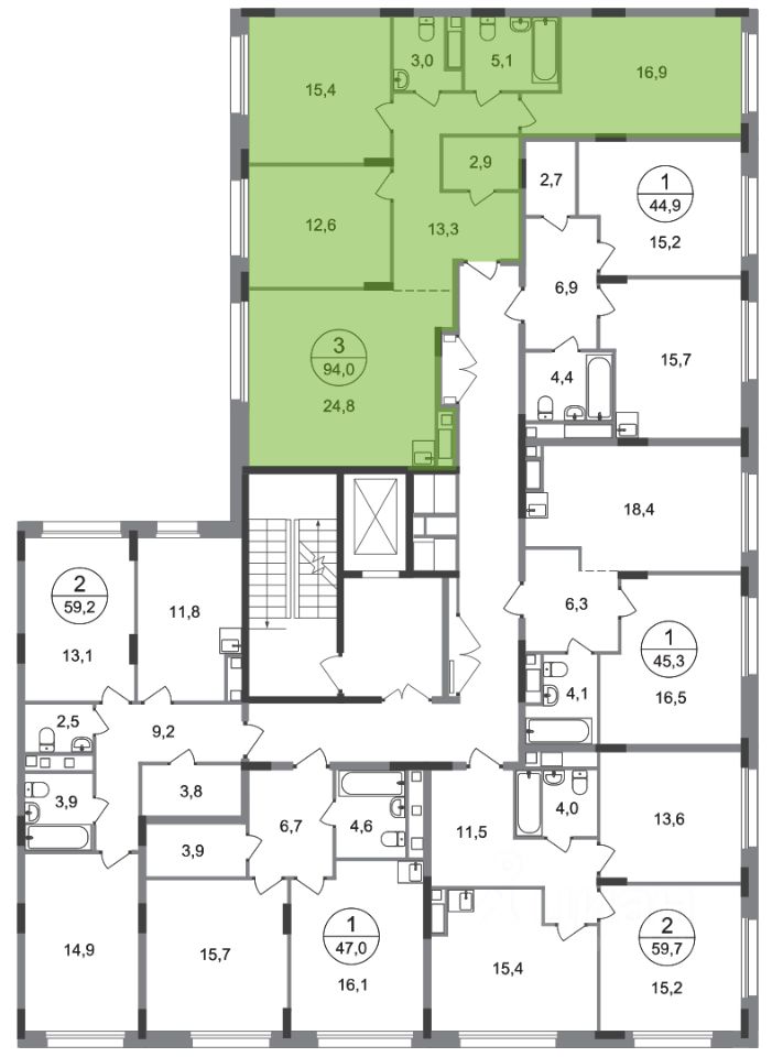 Корпус состоит из 12 секций c переменной этажностью 8-17 этажей.