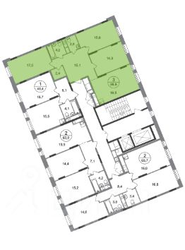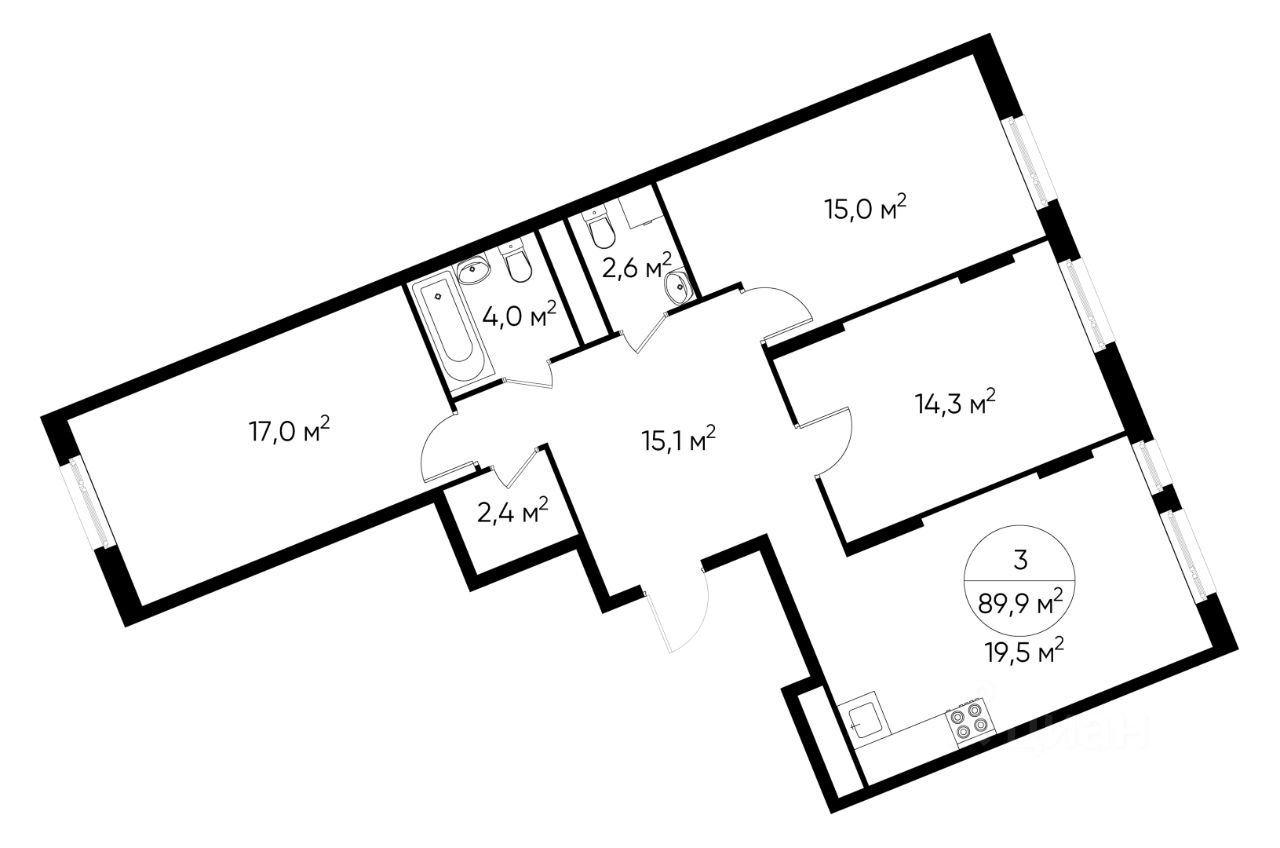 Общая площадь квартиры - 89,9 кв. м, этаж 7 из 17.