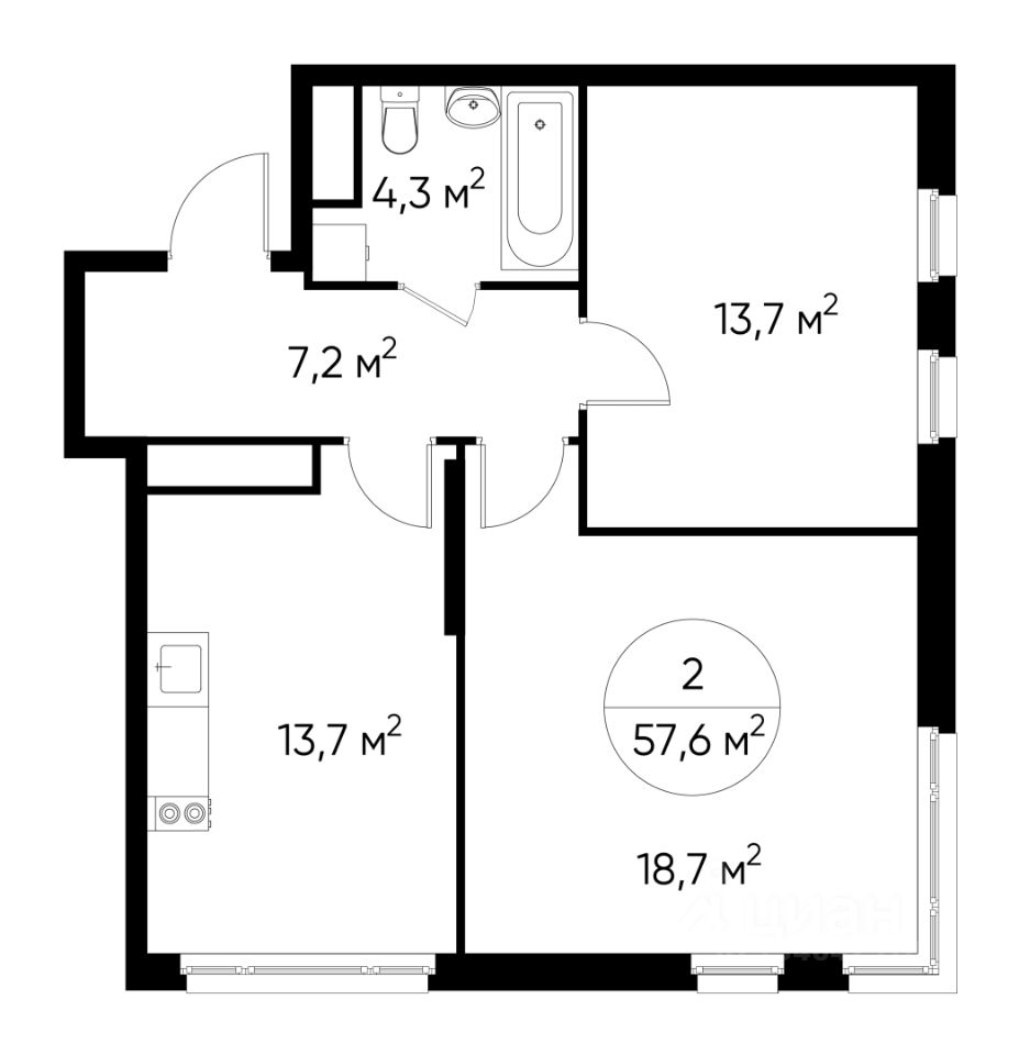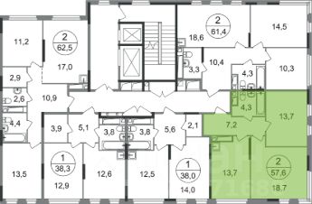 Общая площадь квартиры - 57,6 кв. м, этаж 10 из 17.