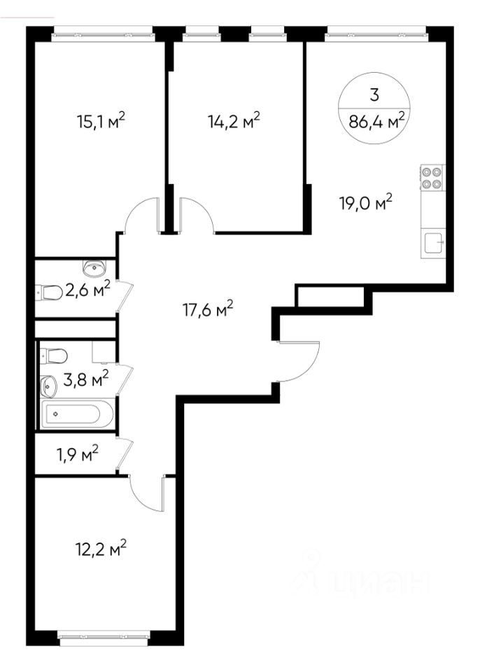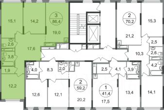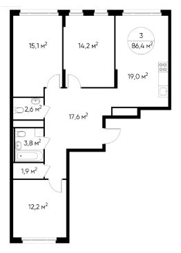Общая площадь квартиры - 86,4 кв. м, этаж 6 из 17.