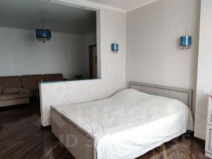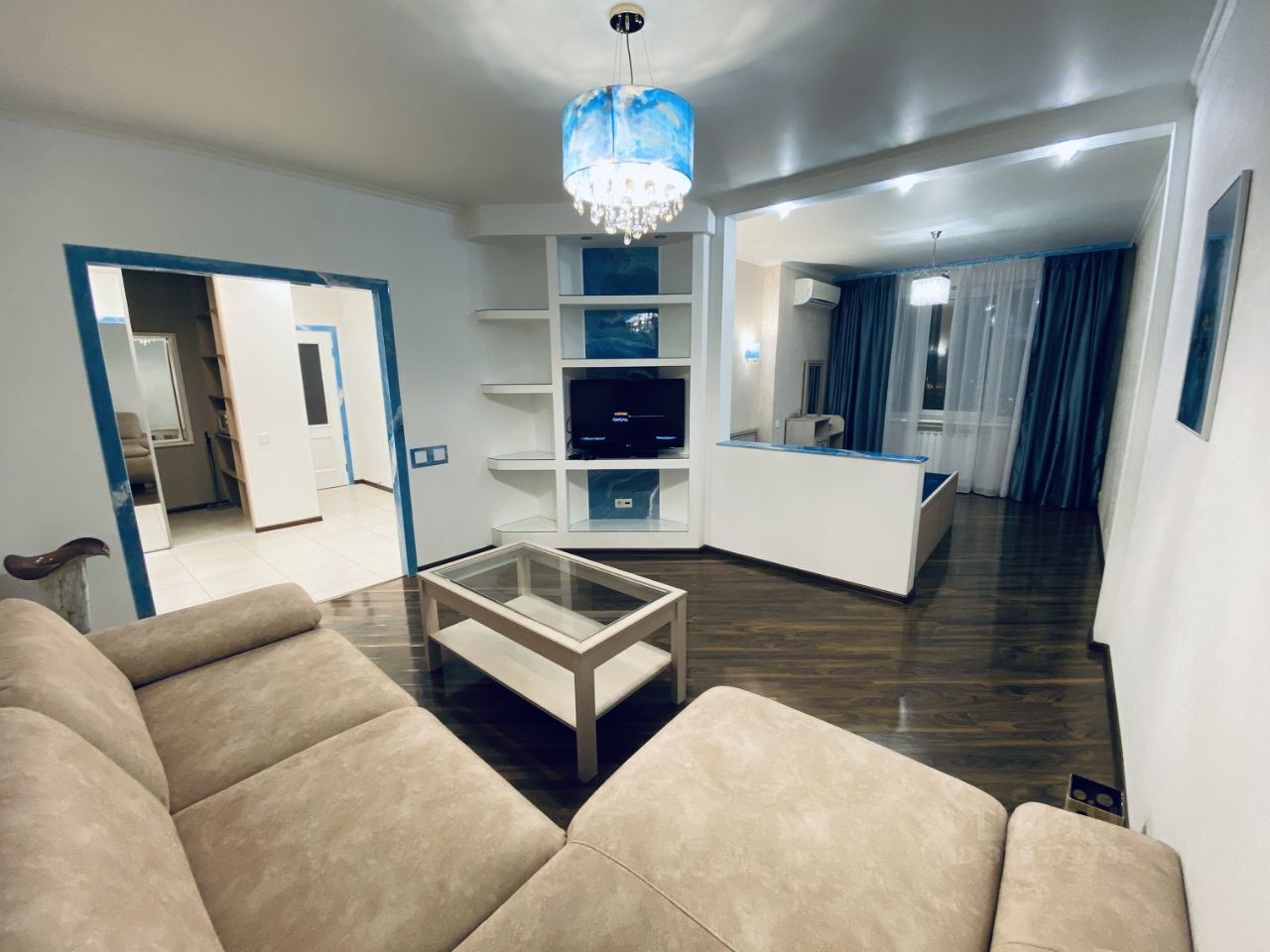 Комната большая разделена перегородкой на спальную зону и гостинную с уютным диваном и ТВ.