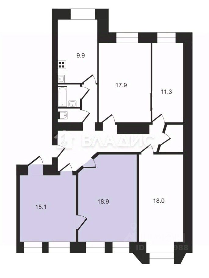 Общая площадь комнат 18,9+17,9+15,1 (70,95% приведенная площадь по документам) а площадь кухни — 9,9 кв м. Хорошее жилое состояние. Отдельный кадастровый номер комнат.