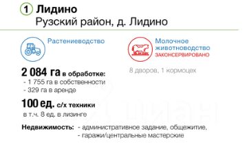 2. Продается сельскохозяйственное предприятие в 115 км от МКАД по Новорижскому (Минскому) шоссе, по адресу: Московская область, Рузский р-н, деревня Лидино (Сумароково, Дробылево), неподалеку от