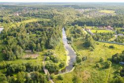 асфальтированный подъезд, рядом протекает река Пахра.