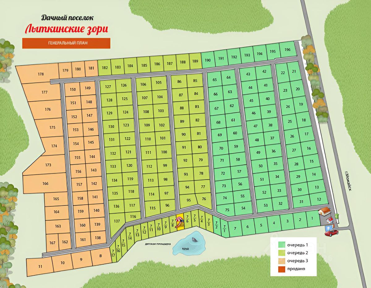 Участок 55 на Плане посёлка. Ровные границы, удобный круглогодичный подъезд по дороге из асфальтовой крошки. Подведено электричество 10 КВт. Дачный поселок Лыткинские зори расположен на Минском шоссе, всего в 2-х километрах от трассы. Это дает прекрасную возможность добираться быстро и удобно. Доехать сюда не составит никакого труда. Вам надо проехать по прямой, по Минскому шоссе 90 километров от МКАД. На указателе 108-й километр повернуть на Верею. От поворота проехать 2 километра и справа Вы увидите въезд в поселок Лыткинские зори.