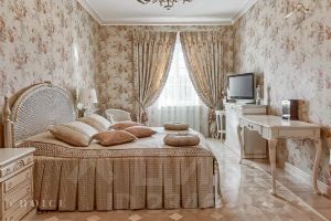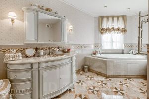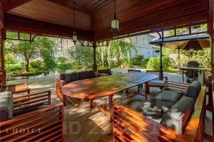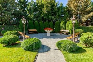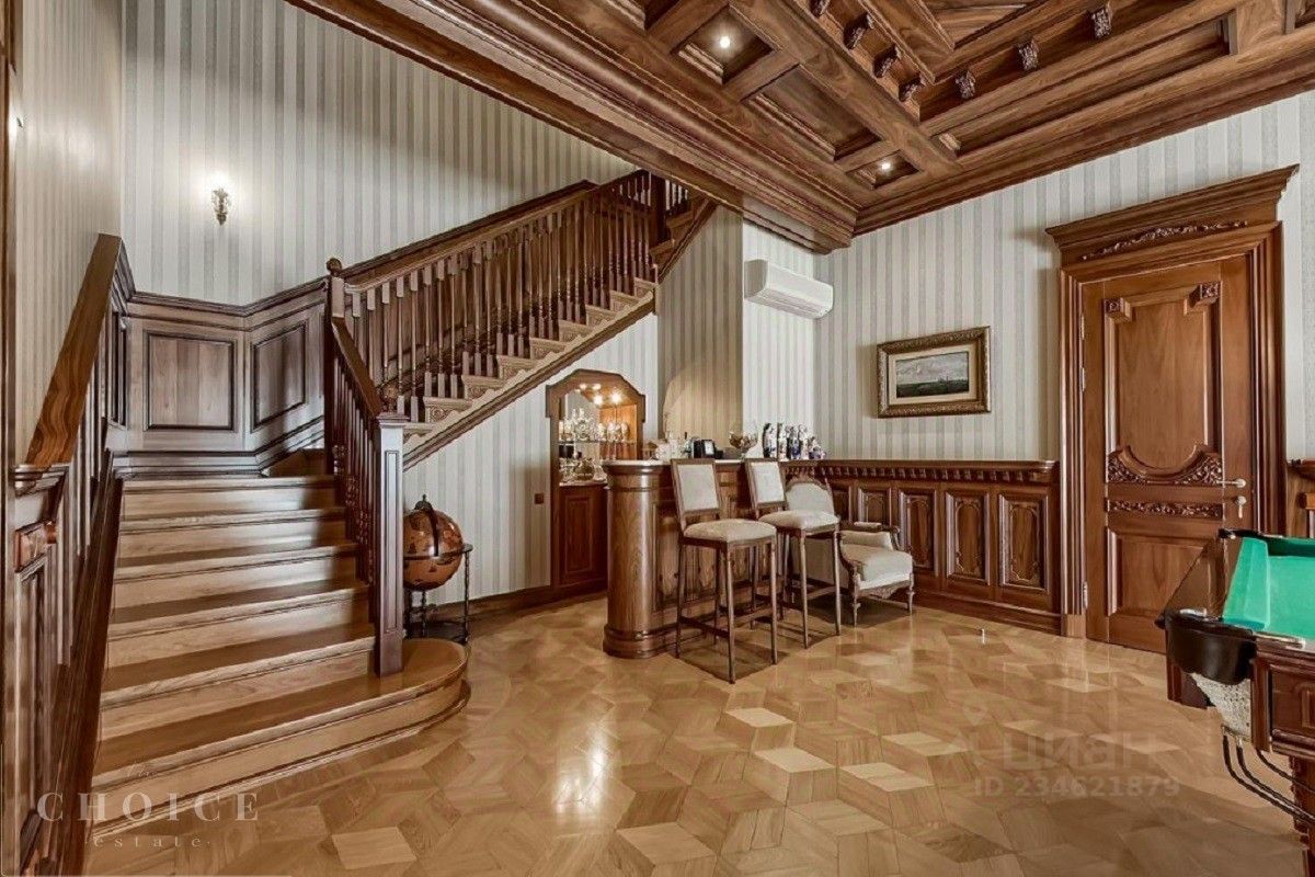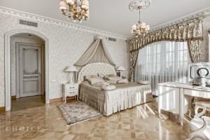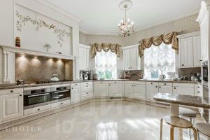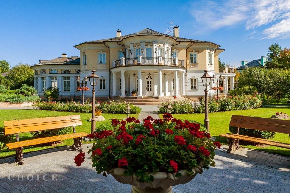 Роскошная загородная резиденция площадью 2000 кв м расположена в живописном коттеджном поселке на 25-м км Новорижского шоссе.Придомовой участок площадью 64,27 кв м находится в собственности. Здесь разбит чудесный сад, высажены декоративные деревья и кустарники, организованы цветники. На вымощенных камнем дорожках стоят скамейки. Двор украшают высокие и маленькие фонари, которые вечером создают здесь просто сказочную атмосферу. От соседей дом скрыт за живой изгородью из пышных деревьев. На участке расположено отдельное строение с гаражом на три машины, автомойкой и четырьмя квартирами для персонала, а также имеется своя детская площадка и зона барбекю с прудом.
