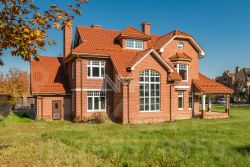 фундамент — лента/монолит, стены — монолит/кирпич, снаружи — кирпич ручной формовки (Бельгия, ATTITUDE Terra rood), перекрытия — монолит, кровля — керамическая черепица (Германия, Сriaton).
