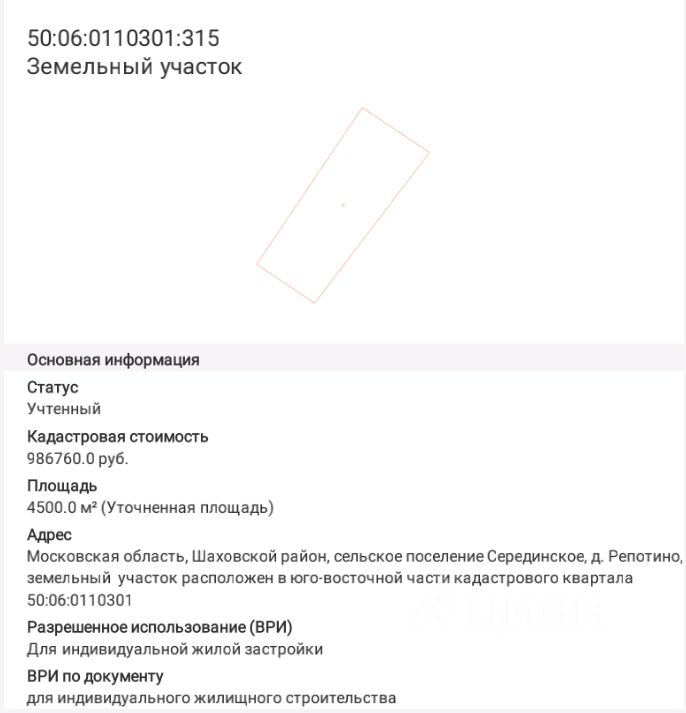 Кадастровый номер 50:06:0110301:315.