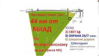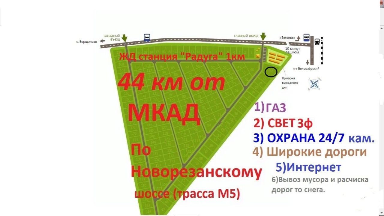 В СТОИМОСТЬ УЧАСТКА ВХОДИТ ЭЛЕКТРИЧЕСТВО, МАГИСТРАЛЬНЫЙ ГАЗ, ШИРОКИЕ ДОРОГИ. СТАНЦИЯ РАДУГА 15 МИНУТ ПЕШИМ ШАГОМ.