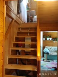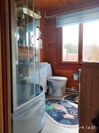 На первом этаже: тамбур-коридор, прихожая, душевая с санузлом и большая гостинная. На втором этаже спальня. Изнутри весь дом отделан вагонкой, пол - ламинат.