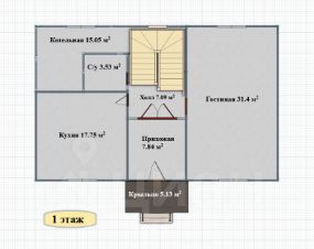 На 1 этаже: просторный холл, кухня 17.75 м2, гостиная 31.40 м2, санузел.