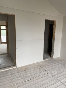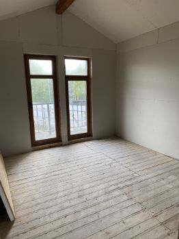 Внутренняя отделка - стены обшиты гипсокартоном, установлена лестница из массива дуба, половая доска.
