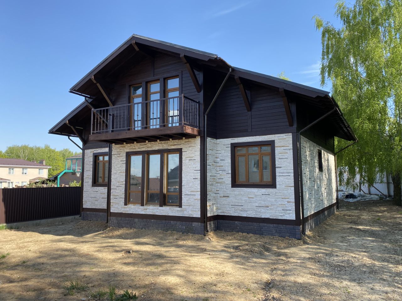 Внешняя отделка - декоративный камень и планкен из лиственницы.