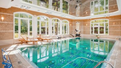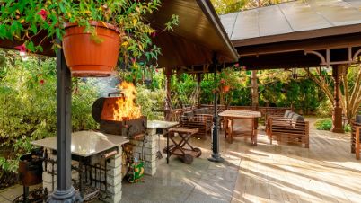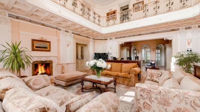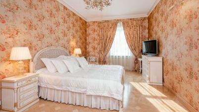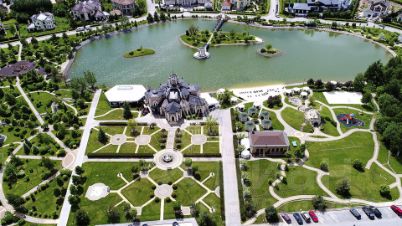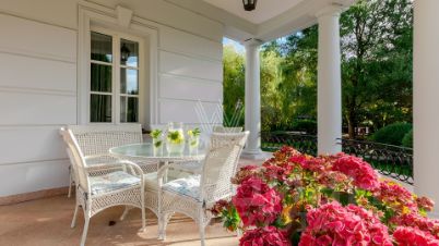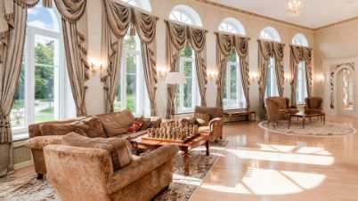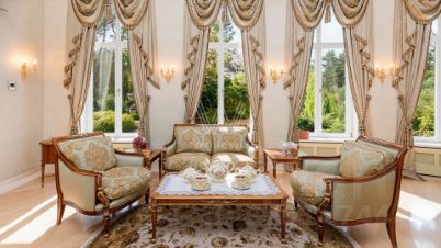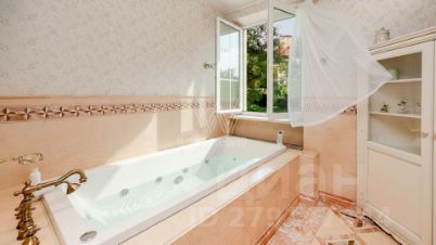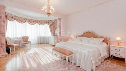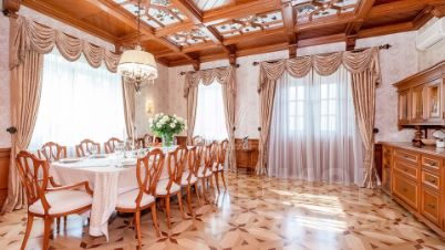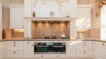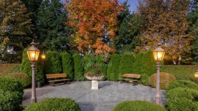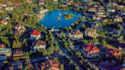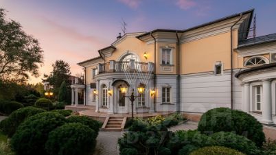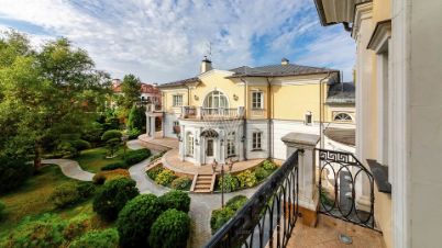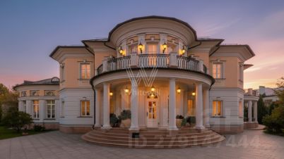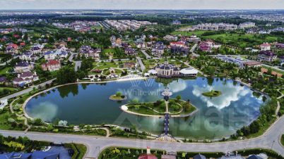 Гринфилд. Загородный особняк площадью 1800 м² построили на участке 65 соток рядом с парком и озером. Фасад в классическом стиле облицован белой и бежевой штукатуркой, декорирован колоннами и полуколоннами, рустовкой, карнизами и наличниками. Интерьер оформлен в теплых светлых оттенках, в отделке использованы паркет из дуба и клена, итальянский мрамор, венецианская штукатурка и лепнина. В резиденции спланировали 7 спален, гостиную с камином и вторым светом, кабинет, кинотеатр, бильярдную, бар и винный погреб, спа-зону с бассейном, сауной и хаммамом. На участке с ландшафтным дизайном, уличным освещением и системой автополива обустроен пруд с водопадами и системой каналов, построена беседка с зоной барбекю, дорожки вымощены гранитом.
