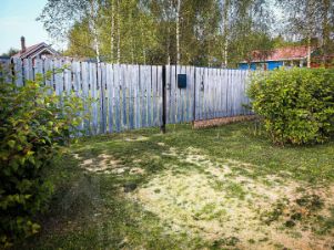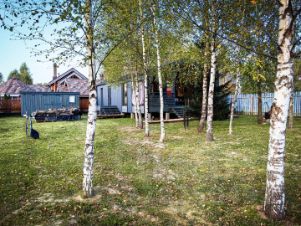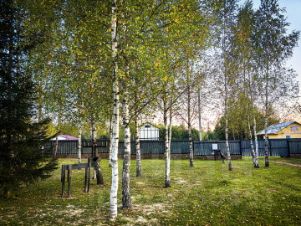 Участок правильной формы, 27 м в ширину и 36 м в длину, с естественным уклоном в сторону дороги, расположен на возвышенности, подтоплений нет, огорожен забором по периметру; растут берёзы, ёлка, грибы, несколько кустов гортензий, декоративный кустарник и сосны со стороны дороги, зарегистрирован.
