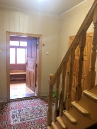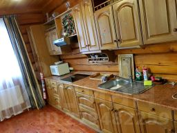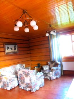 Дом выполнен из лафета, обложенного кирпичом, общей площадью - 240 кв.м, 2 этажа, 3 уровня. Отопление: котёл на жидком топливе или электричестве. Электричество, артезианская скважина, септик. Окна деревянные, двухкамерные. Кровля - ондулин.