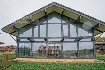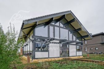 Год постройки: 2021. Материал стен: Стены выполнены из деревянного каркаса по технологии "фахверк" компании "VELESA". Между элементами фахверка стены заполняются панорамным остеклением и панелями из деревянного каркаса с заполнением пустот теплоизоляционными плитами. Облицовка стен: Закаленное стекло, клееный брус, деревянные панели, элементы фахверка.