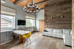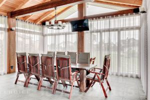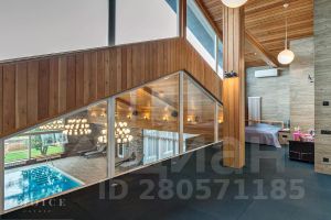 Загородная резиденция в скандинавском стиле построена на вытянутом вдоль канала участке площадью 39 соток, включающая в себя основной дом площадью 1000 м2 (представлен под чистовую отделку), меблированным гостевым домом со SPA-зоной и бассейном площадью 650 м2 и гаражом на 2 автомобиля с квартирой для персонала. В основном доме спланировали 7 спален, просторную гостиную с камином и вторым светом, бильярдную и зону для досуга. В гостевом доме площадью 650 м2 расположены: гостиная, кухня, спальня и спортзал. К дому пристроена теплая беседка площадью 50 м², с двух сторон окруженная панорамными раздвижными окнами. В беседке создана уютная барбекю-зона, состоящая из мангала, казана, духового шкафа и тандыра. Spa-комплекс занимает отдельное крыло гостевого дома. Для комфортного отдыха в комплексе предусмотрены сауна, хаммам и большой бассейн (124,5). Гараж на 2 автомобиля и навес на 4 автомобиля, а также квартира для персонала соединены с гостевым домом отдельным входом. Участок расположен в застроенной и обжитой части поселка и с двух сторон окружен живой изгородью. На участке выполнен ландшафтный дизайн, построена детская плозадка, Бонсаи, выстреженные в форме шара кустарники, фруктовый сад, крупные лиственные и хвойные деревья с густыми раскидистыми кронами — собраны в ландшафтную композицию, подсвеченную вечерами. Дорожки и площадки вымощены гранитной брусчаткой. Резиденция находится под охраной и оснащена системой видеонаблюдения. Весь проект реализован с использованием технологий "зелёного строительства", позволяющих значительно сократить затраты энергии на отопление, и оснащен системой "умный дом", которая включает в себя контроль отопления, освещения и мультимедиа.