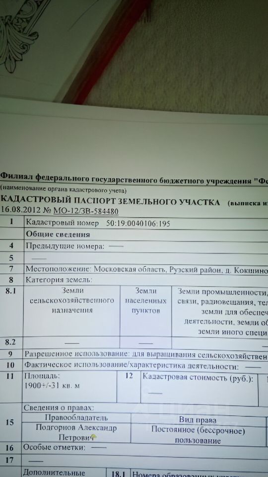 Земельный участок в д. Кокшино, площадь 19 сот. (18*105). Не заросший, ежегодно обрабатывается. Рядом дорога асфальт, остановка автобуса. Также рядом Рузское водохранилище. Документы оформлены под Ижс! Кадастровый номер 50:19:0040106:195.