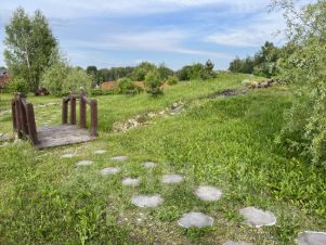 Организована площадка-парковка на 2 машины, мощеные дорожки для комфортного передвижения по участку.