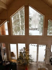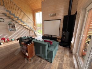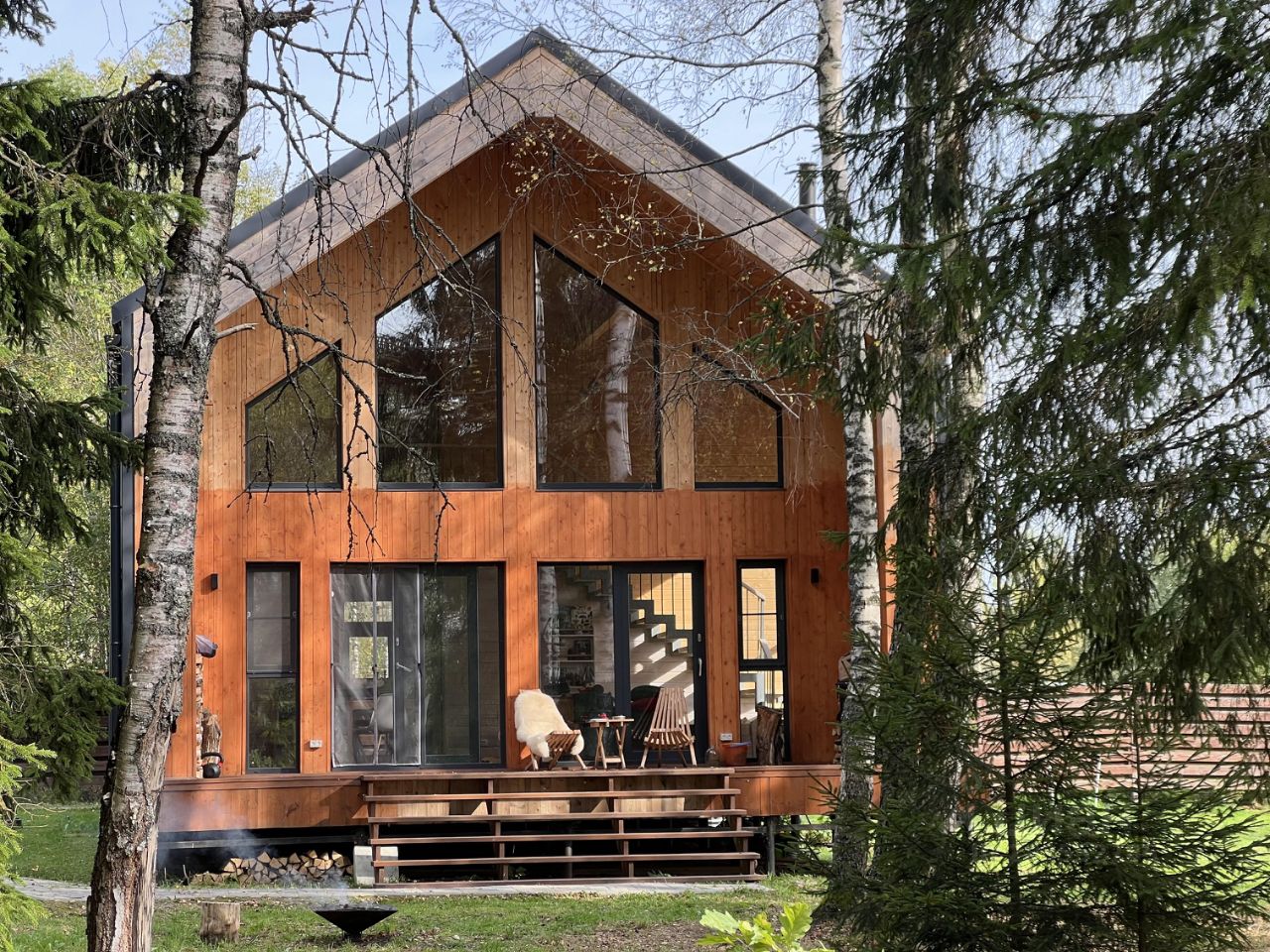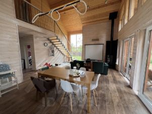 На первом этаже светлая кухня-гостиная с потолками 6,5 м, печь-камин в современным стиле, огромные окна, которые открывают вид на лес, просторная терраса (23 м²), гостиная зона с диваном и большим экраном для семейного кинотеатра.