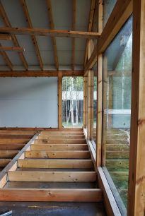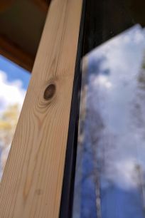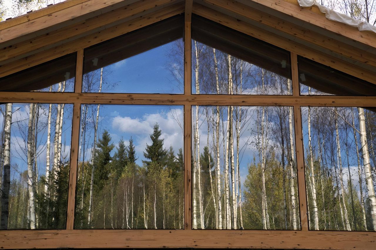Из панорамных окон красивый вид на участок, где растут молодые берёзы