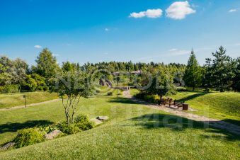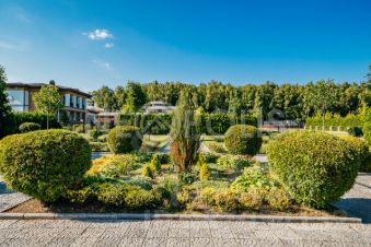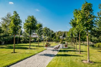 Просторный ровный участок с собственным выходом в лес и с парковым ландшафтным дизайном: газон, розарий, ива, декоративные кустарники, вдоль забора высажены туи, вымощены дорожки, уличное освещение, выполнен дренаж.