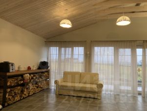 На первом этаже (238 кв. М) расположены: два тамбура 4,5 и 2,5 кв. М, холл-прихожая 15 кв. М, две кладовки 8 и 3 кв. М, котельная 10 кв. М, гостиная-столовая с камином и вторым светом 52 кв. М, терраса 58 кв. М. Кухня 16 кв. М, комната 20 кв. М, кабинет 15 кв. М, гардеробная 5 кв. М, два санузла 8 и 2 кв. М. На застеклённой террасе имеется русская печь, мангал и плита для казана.