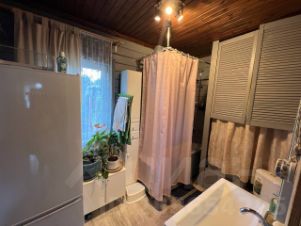 В доме 2 спальни наверху, кухня, гостинная-столовая, ванная комната с помещением для сауны ( сейчас используется как кладовая)
