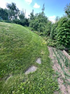 Плодоносит фруктовый сад (яблони, груши, черешня, персик, смородина, малина, клубника) всё оформлено в стиле природного сада.