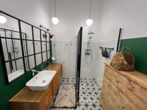 Большая часть мебели сделанная по индивидуальному проекту из натуральных пород дерева. Оборудованная кухня, посудомоечная машина, холодильник, кофемашина.